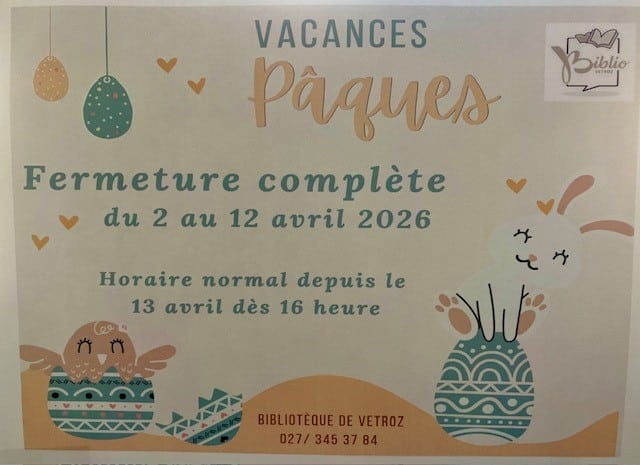Bibliothèque – Vacances de Pâques (2 au 12 avril 2026) – la biblio est fermée. Elle est également fermée le vendredi 20 mars 2026 (weekend St-Joseph)