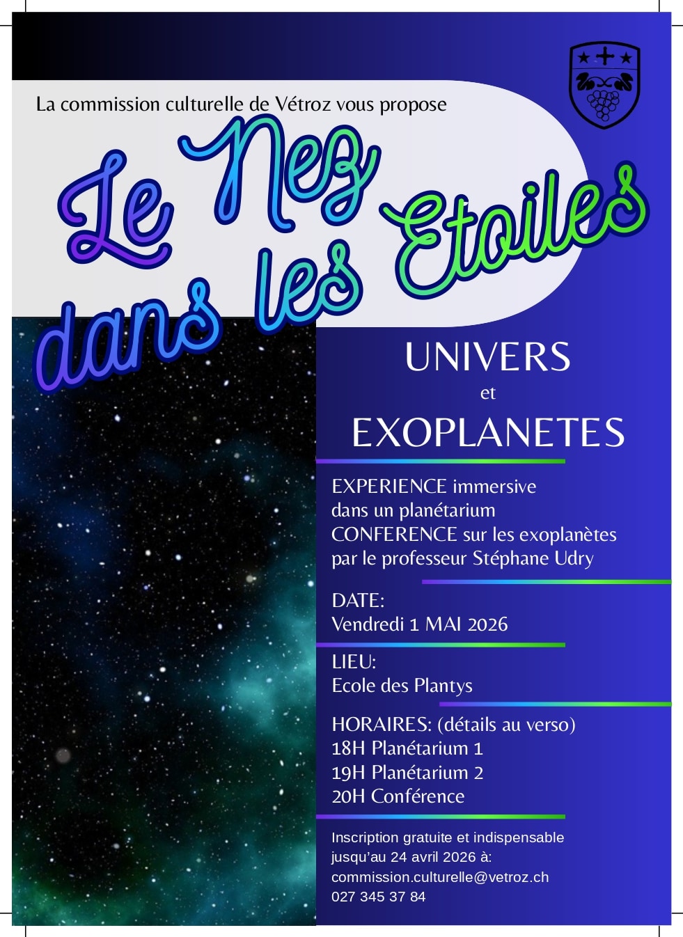 La commission culturelle de Vétroz vous invite à une conférence sur les exoplanètes par M. Stéphane Udry, professeur au département d’astronomie de l’université de Genève, co-directeur du Pôle de recherche National PlanetS et ancien directeur de l’observatoire de Genève.
