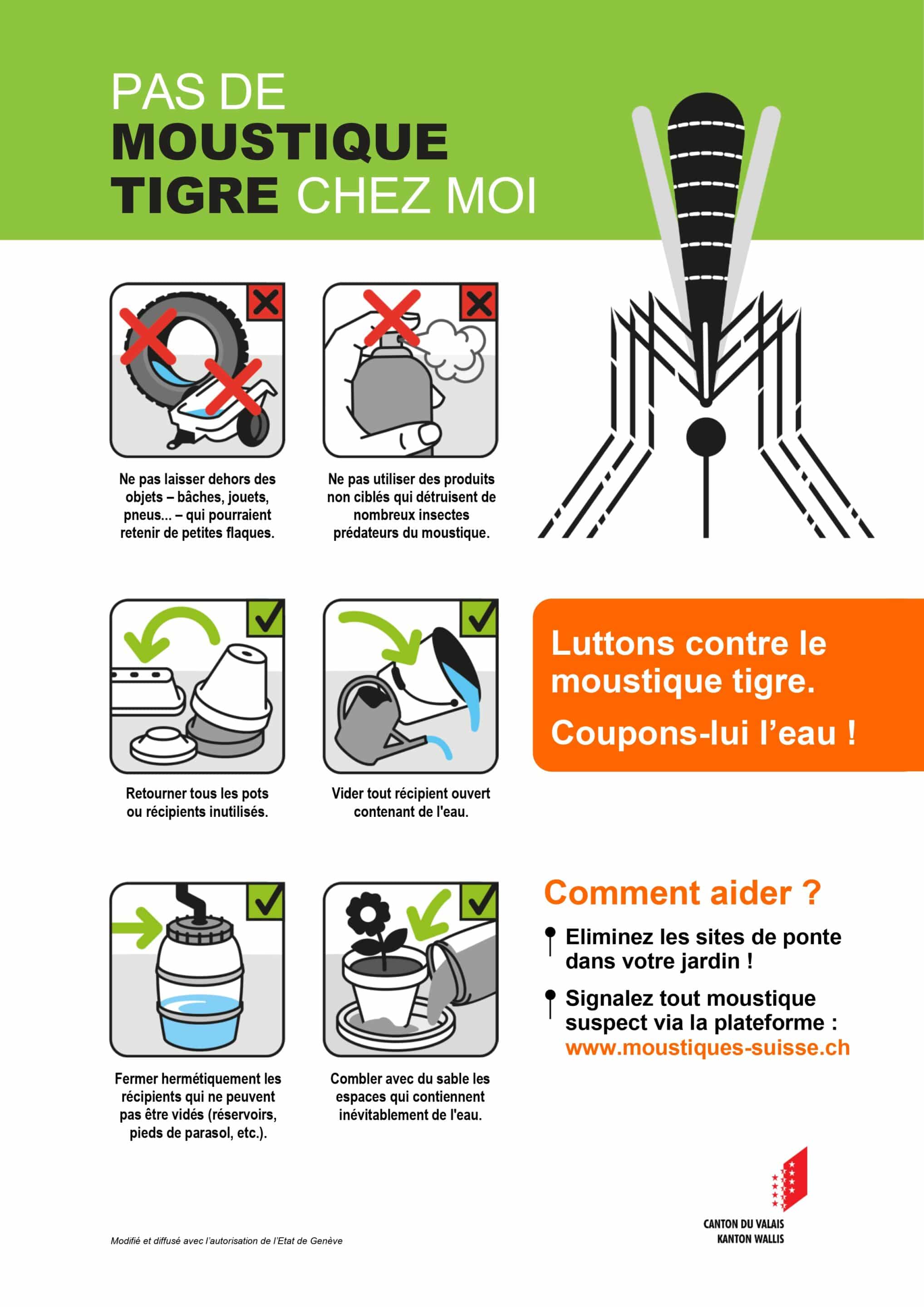Adopter dès aujourd’hui ces gestes simples permettra de fortement diminuer les chances d’installation du moustique tigre en Valais et de retarder au mieux son expansion. Ainsi, les dérangements et les risques sanitaires liés à cette espèce invasive seront réduits au maximum.