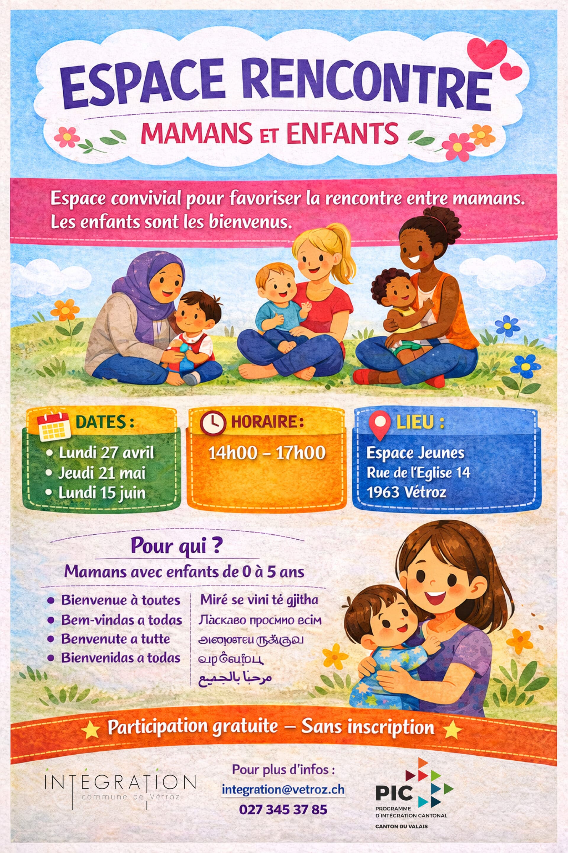 Que vous soyez nouvel·le à Vétroz, à la retraite, à la maison avec les enfants ou simplement curieux·se, venez comme vous êtes, sans inscription. Un accueil convivial vous attend, avec une boisson offerte par le service d’intégration.