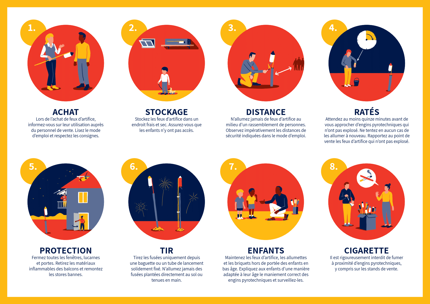 La population est invitée à respecter strictement les consignes de sécurité, notamment en matière de stockage, de distances de sécurité, de protection des bâtiments et de surveillance des enfants. Une affiche annexe rappelant les règles essentielles pour profiter des feux d’artifice en toute sécurité est mise à disposition.